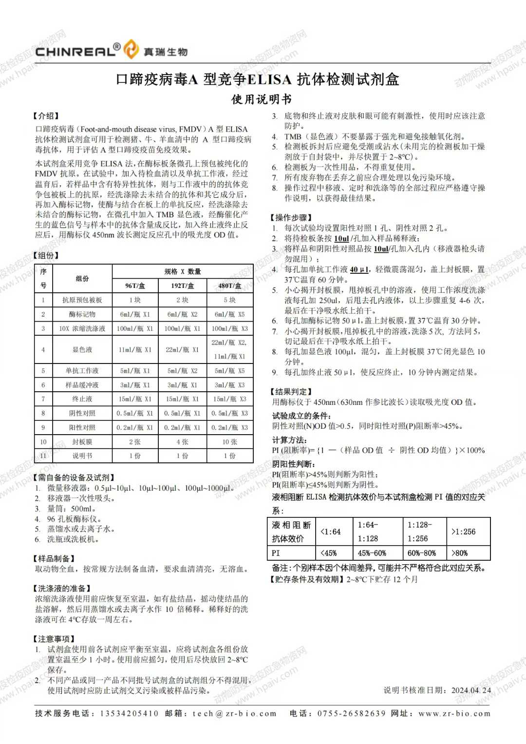 口蹄疫病毒A型竞争ELISA 抗体检测试剂盒(真瑞)