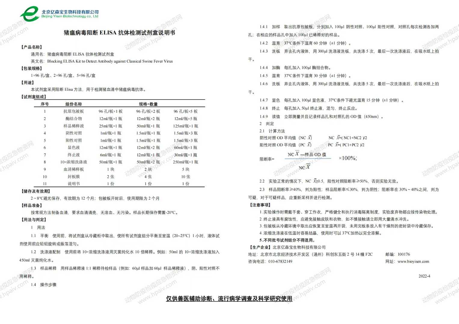 猪瘟病毒阻断 ELISA 抗体检测试剂盒(亿森宝)