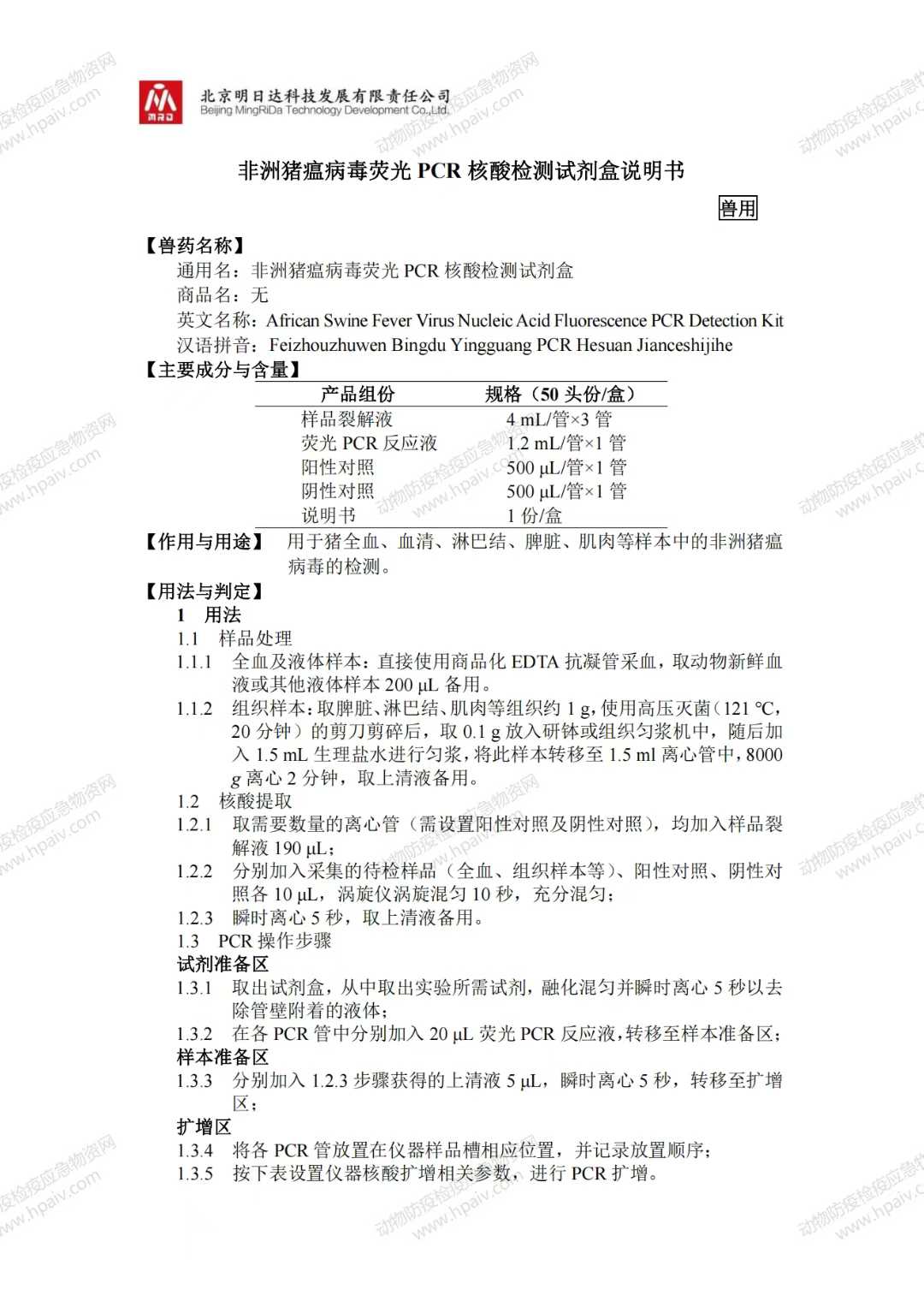 非洲猪瘟病毒荧光 PCR 核酸检测试剂盒(明日达)